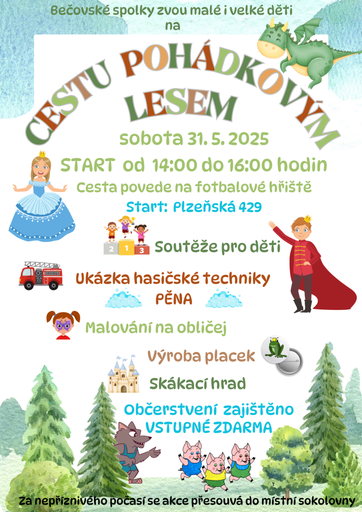 Bečovské spolky zvou malé i velké na Dětský den, který se uskuteční v sobotu 31. května 2025 od 14:00 do 16:00 hodin. Start - Plzeňská 429 (ulice pod "novými serpentýnami") směrem na fotbalové hřiště. Připraveny jsou soutěže pro děti, ukázka hasičské techniky, malování na obličej a výroba placek. Přijďte si užít také skákací hrad a další zábavu! Při nepřízni počasí se program přesouvá do místní sokolovny.