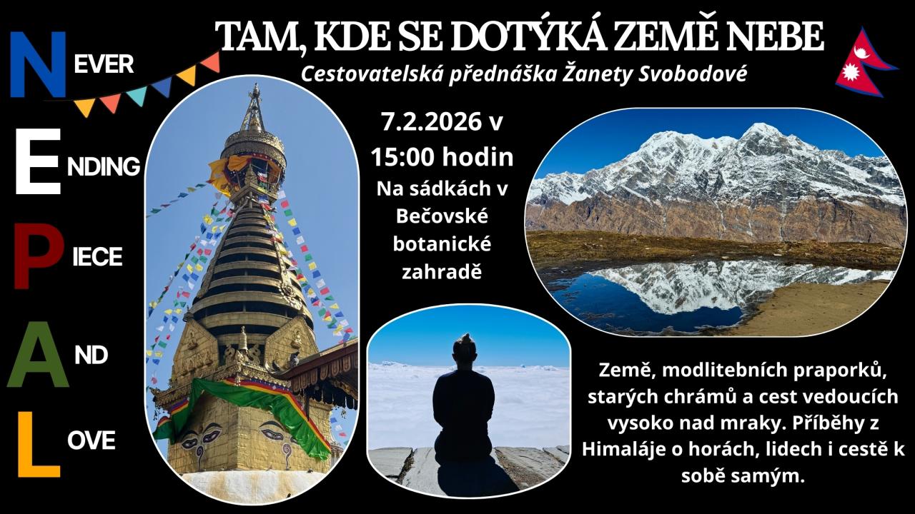 Zveme vás na cestovatelskou přednášku naší Žanety Svobodové, která se uskuteční 7. února 2026 v 15:00 hodin. Přednáška se bude konat v učebně Ekocentra na sádkách Bečovské botanické zahrady. Účastníci se mohou těšit na fascinující příběhy o Nepálu, jeho tradicích a krásách. Žaneta Svobodová přiblíží příběhy z Himaláje.... Přijďte se inspirovat a prožít cestu k sobě samým prostřednictvím vyprávění o horách a lidech v této kouzelné zemi.